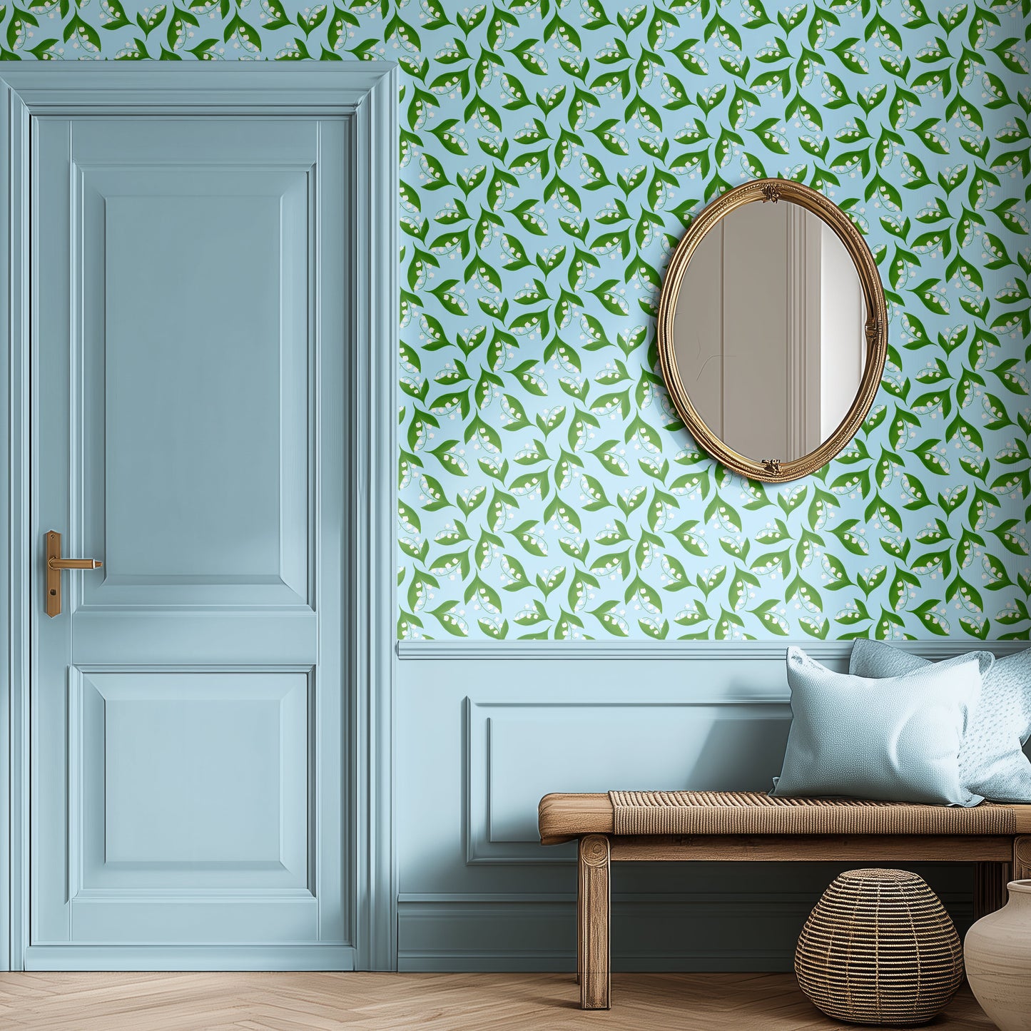 blue lily of the valley wallpaper, blue floral wallpaper, hallway wallpaper, made to order luxury floral wallpaper, calm blue wallpaper, pastel blue wall covering