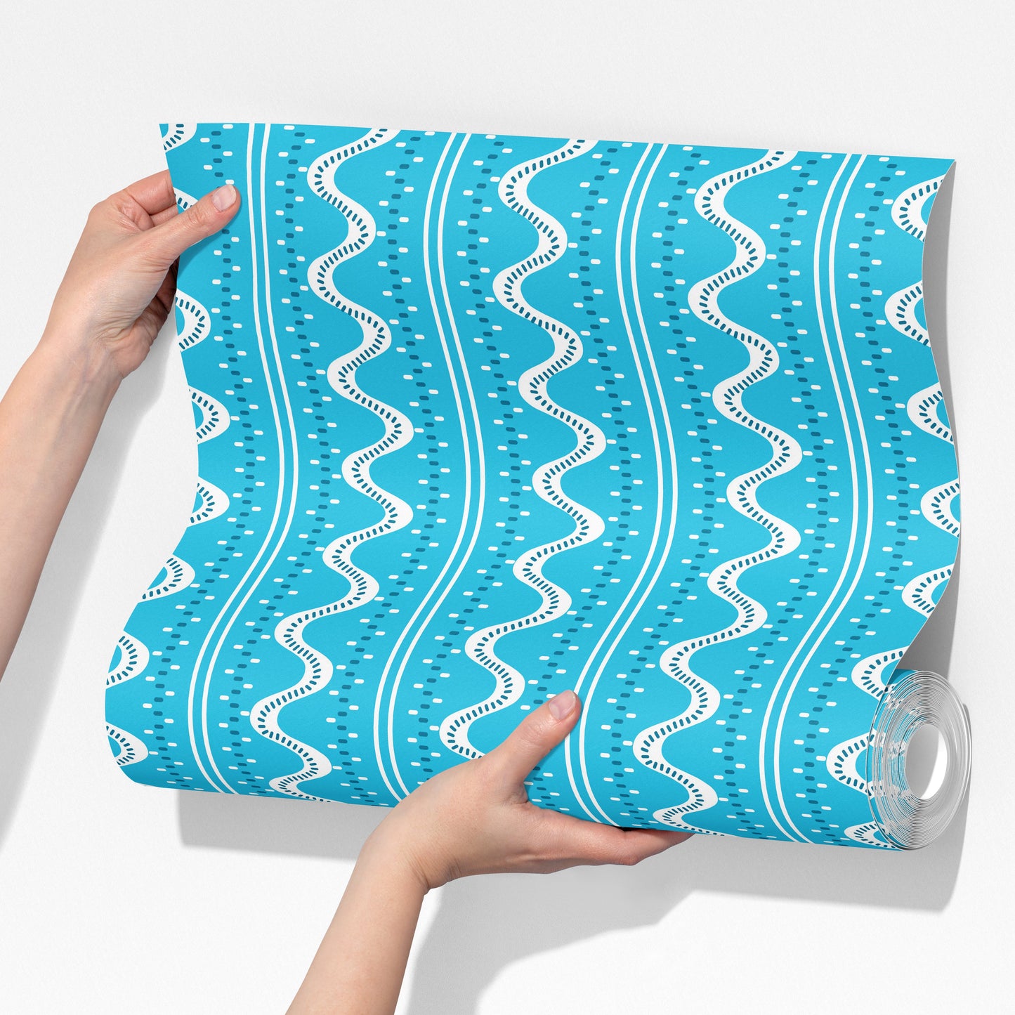 turquoise blue wallpaper modern bedroom, modern living room wallpaper in blue colour, blue and white wallpaper, wavy design, wavy squiggle wallpaper