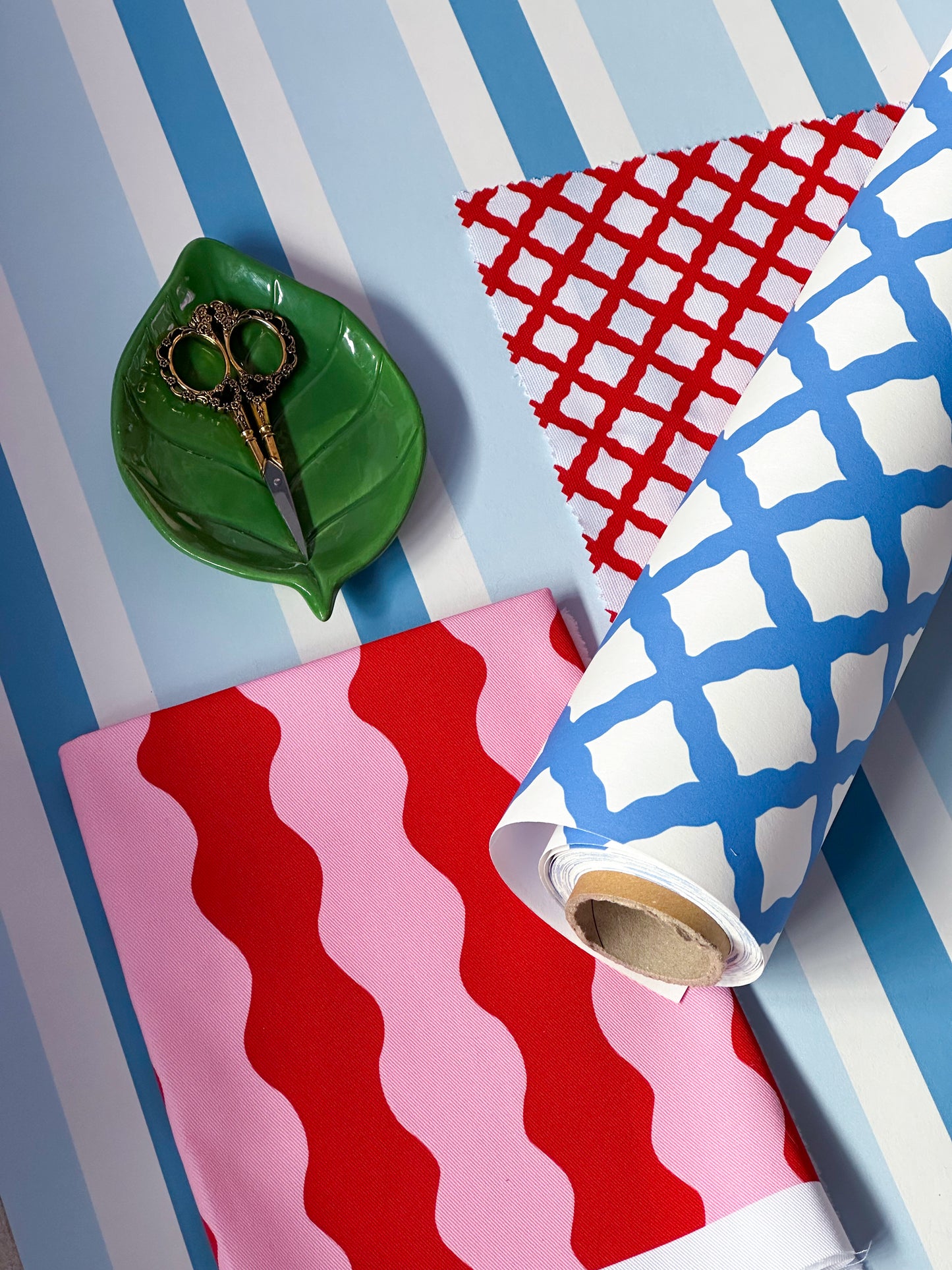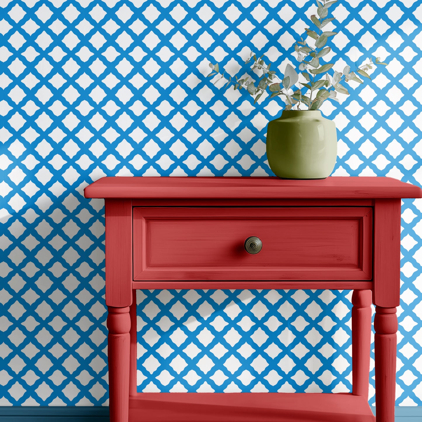 Trellis Charm in deep turquoise blue offers a fresh, elevated interpretation of the timeless lattice motif. Instead of rigid geometry, the trellis is formed with subtly wavy lines, introducing a soft, hand-drawn character that brings warmth and artistry to the design. This gentle undulation adds movement and visual interest, creating a pattern that feels both structured and beautifully organic.