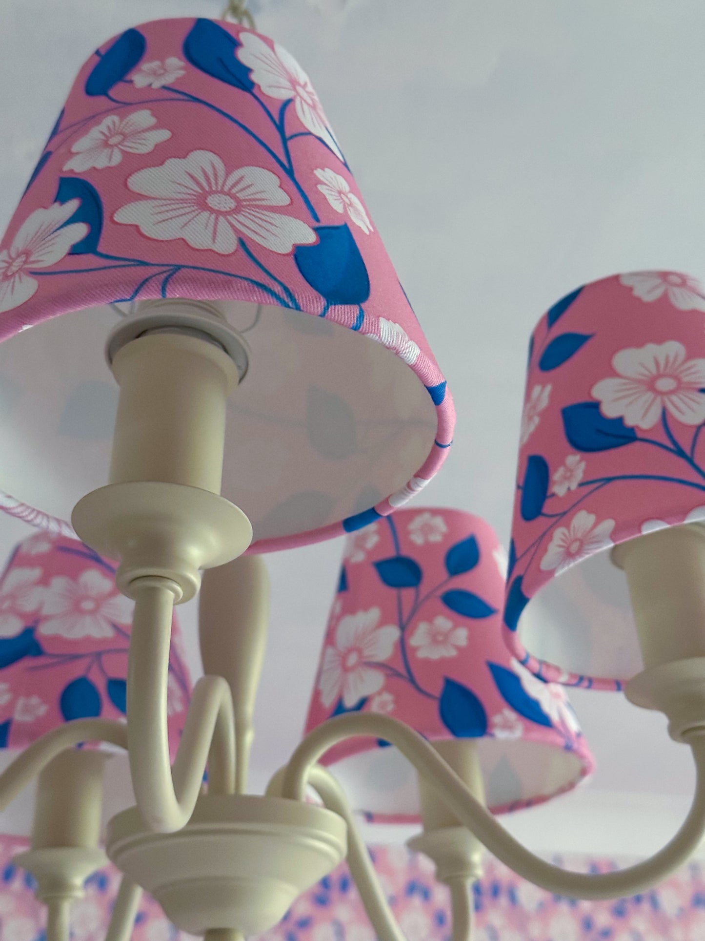 Beautiful candle clip lampshade made with my turquoise blue 'Blossom Trail' design on a warm rose pink background, in 100% cotton fabric.