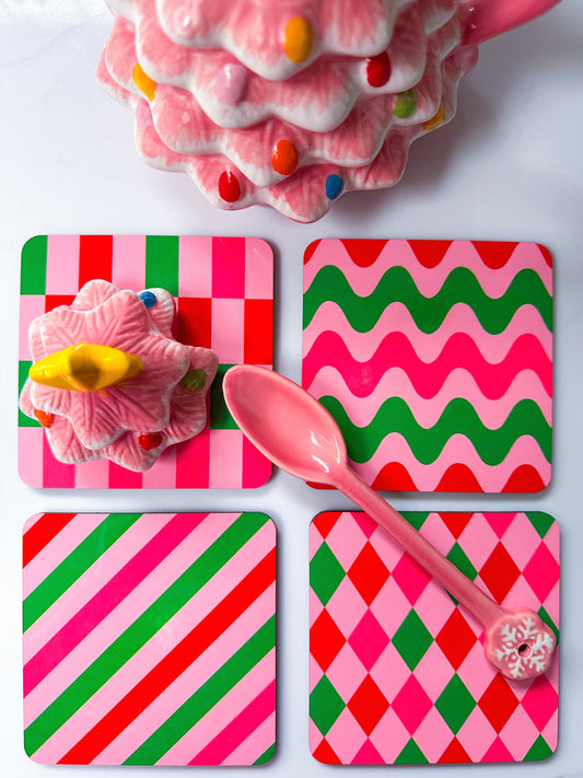 ‘Abstract mix’ Christmas coasters in pink, red and green