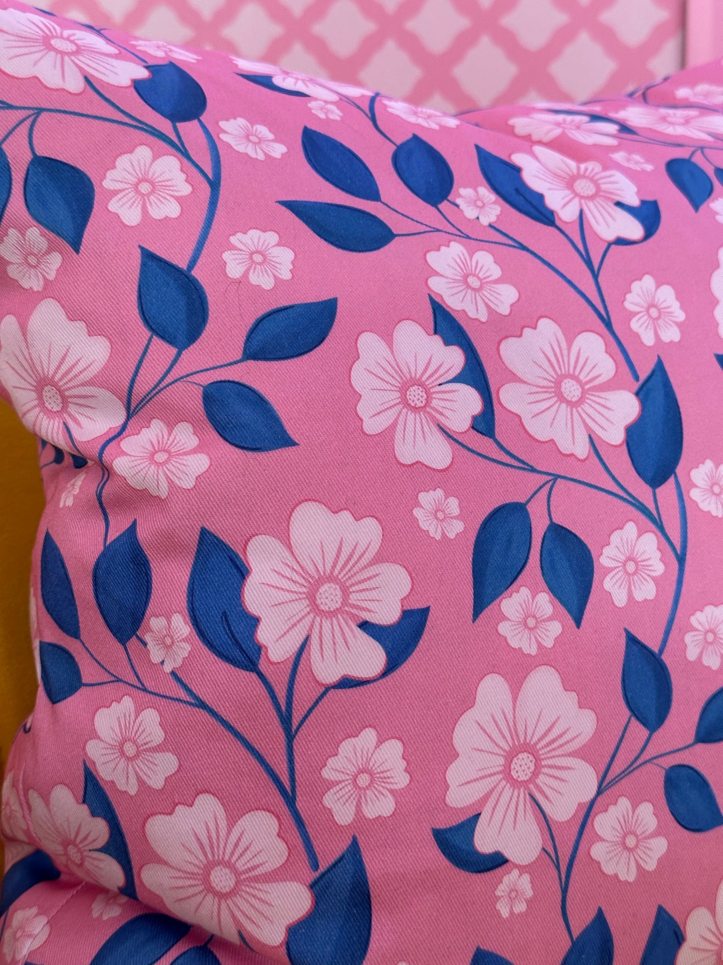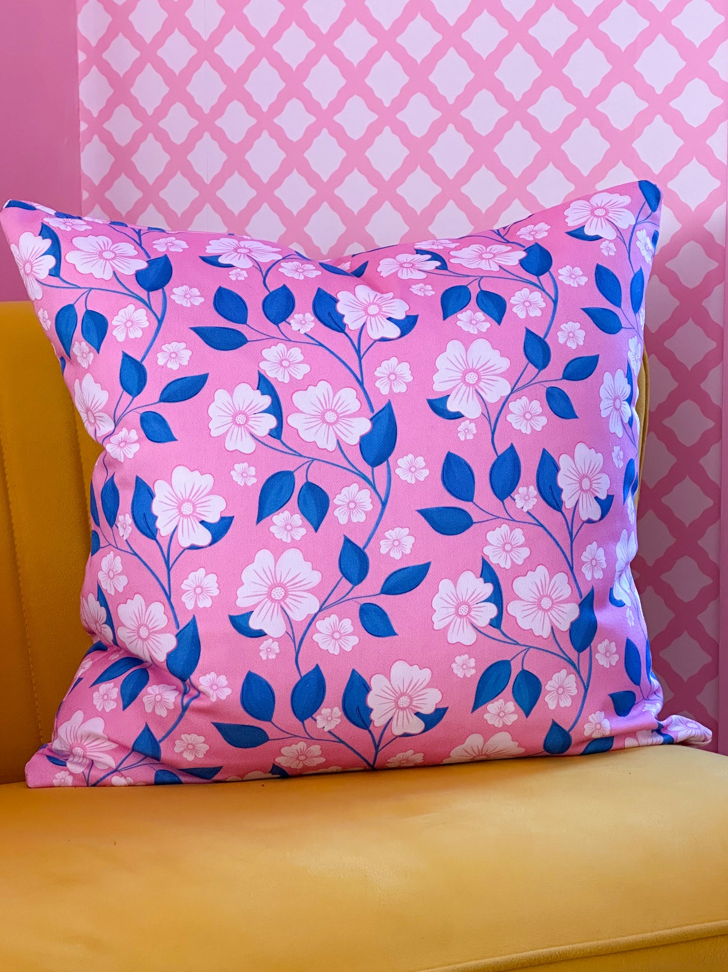 Add a touch of elegance and fun to any space with my ‘Blossom Trail’ fabric in pink and blue. Featuring white petals and blue trailing pattern on my signature pink background, this fabric is perfect for adding a pop of colour to your décor. The modern design adds a touch of sophistication, making it the perfect choice for any style.