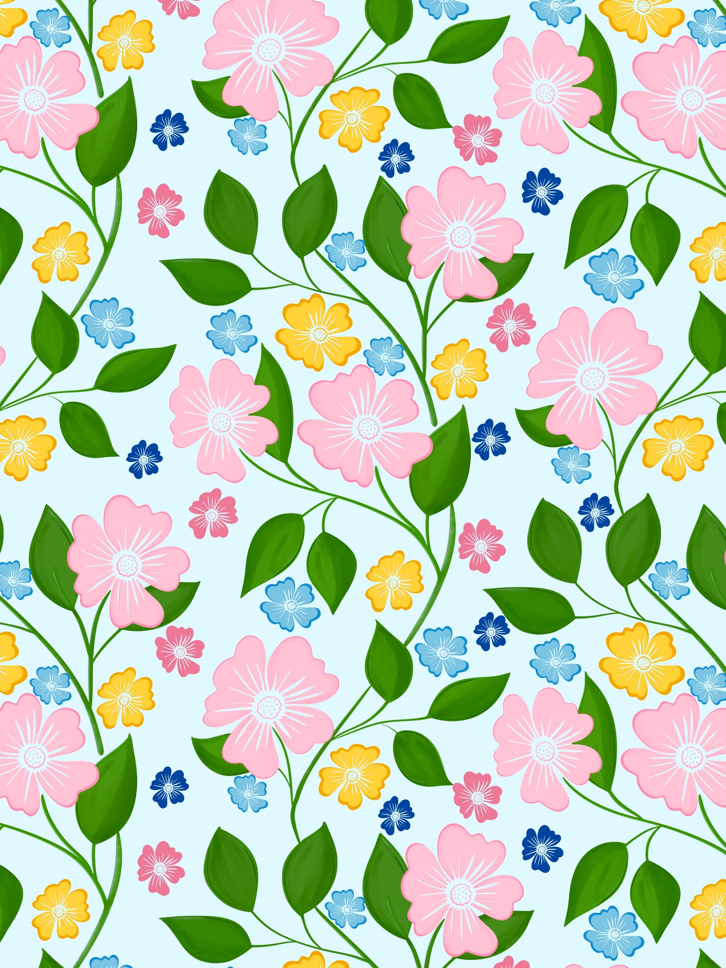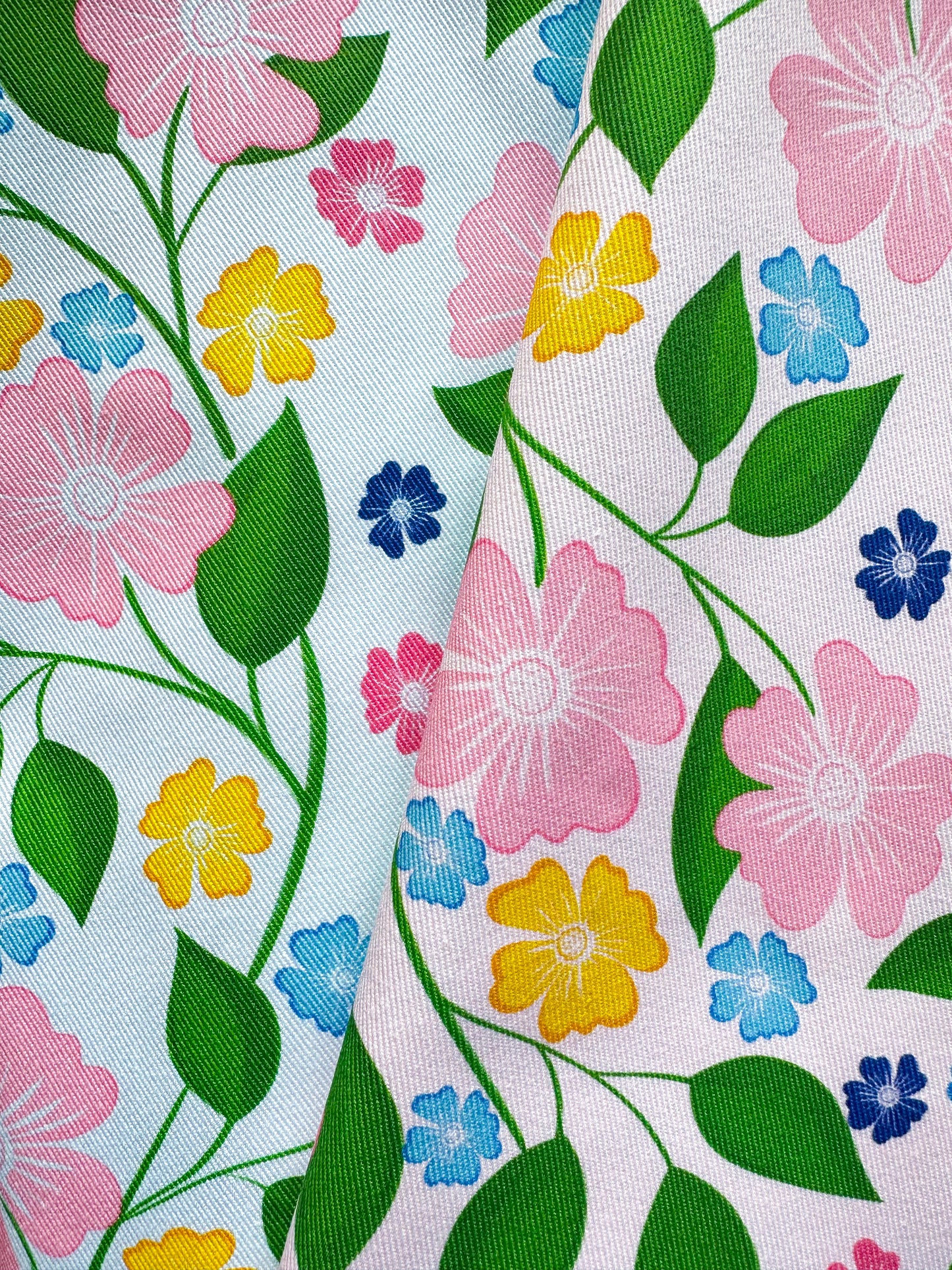 Colorful floral pattern with pink, yellow, and blue flowers on a light blue background, designer floral fabric in pastel colours, soft pastel upholstery fabric, lampshade, sofa cover