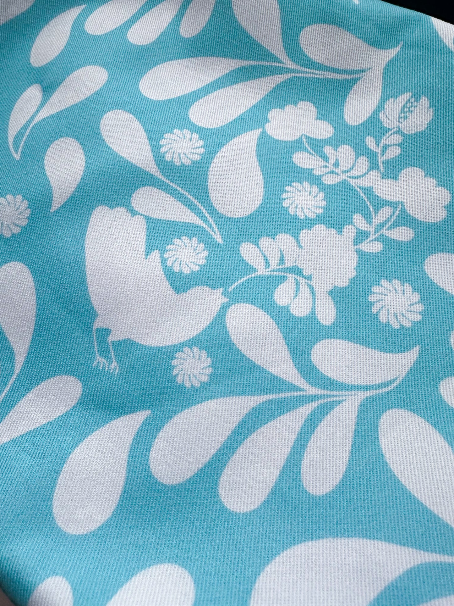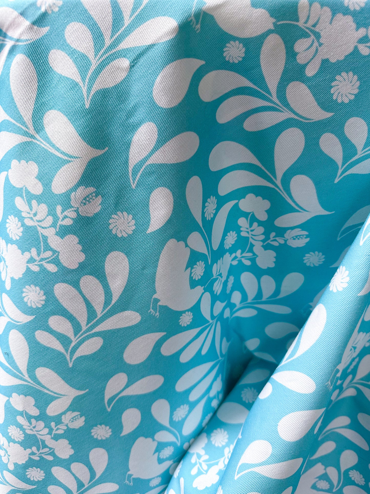 bird and leaves pattern fabric for upholstery, curtains, chairs, hungarian folklore fabric, pastel blue and white fabric, palm beach, hamptons colour fabric, luxury fabric
