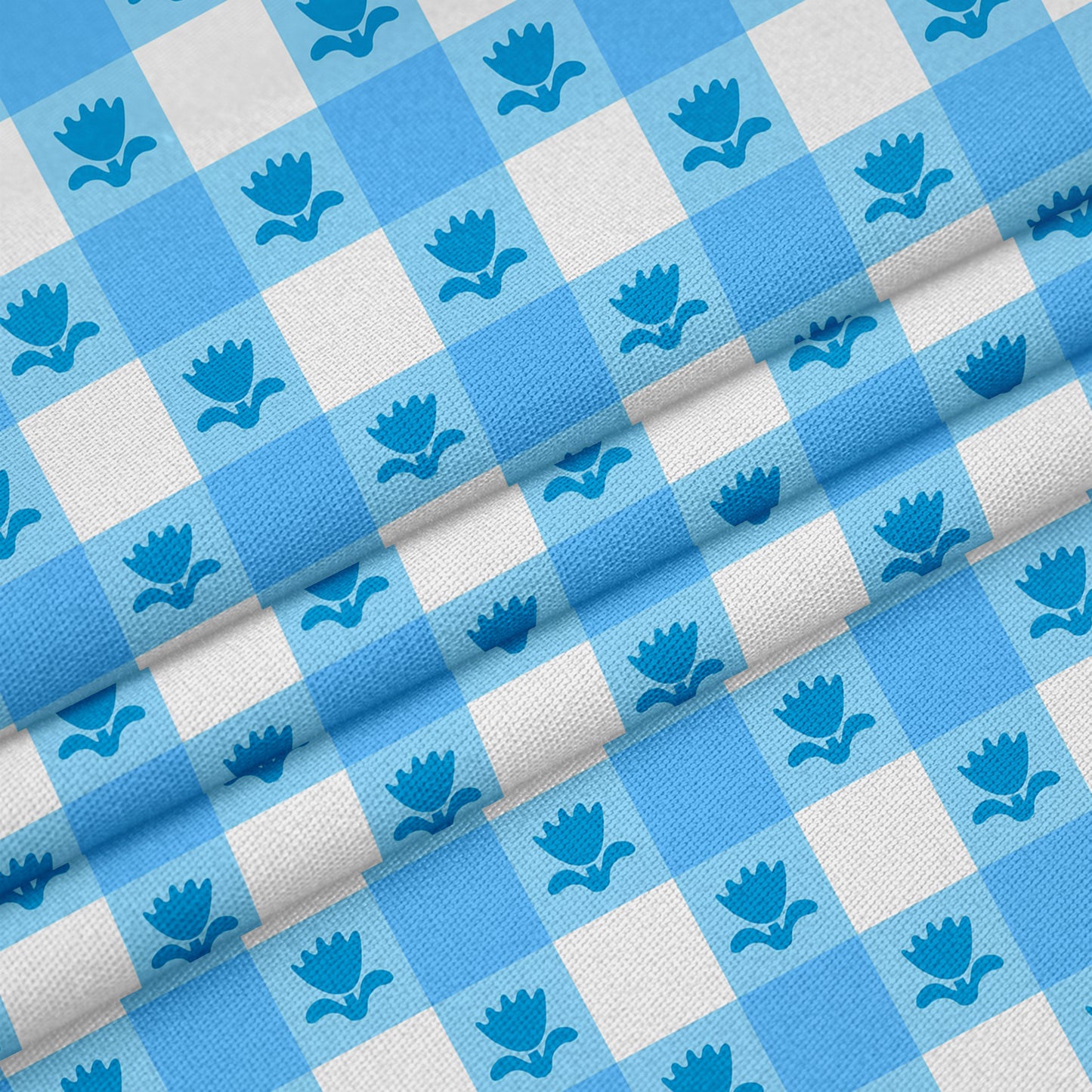 blue gingham fabric with tulips, tulip gingham fabric, small gingham fabric for sewing, upholstery, chairs, cushions