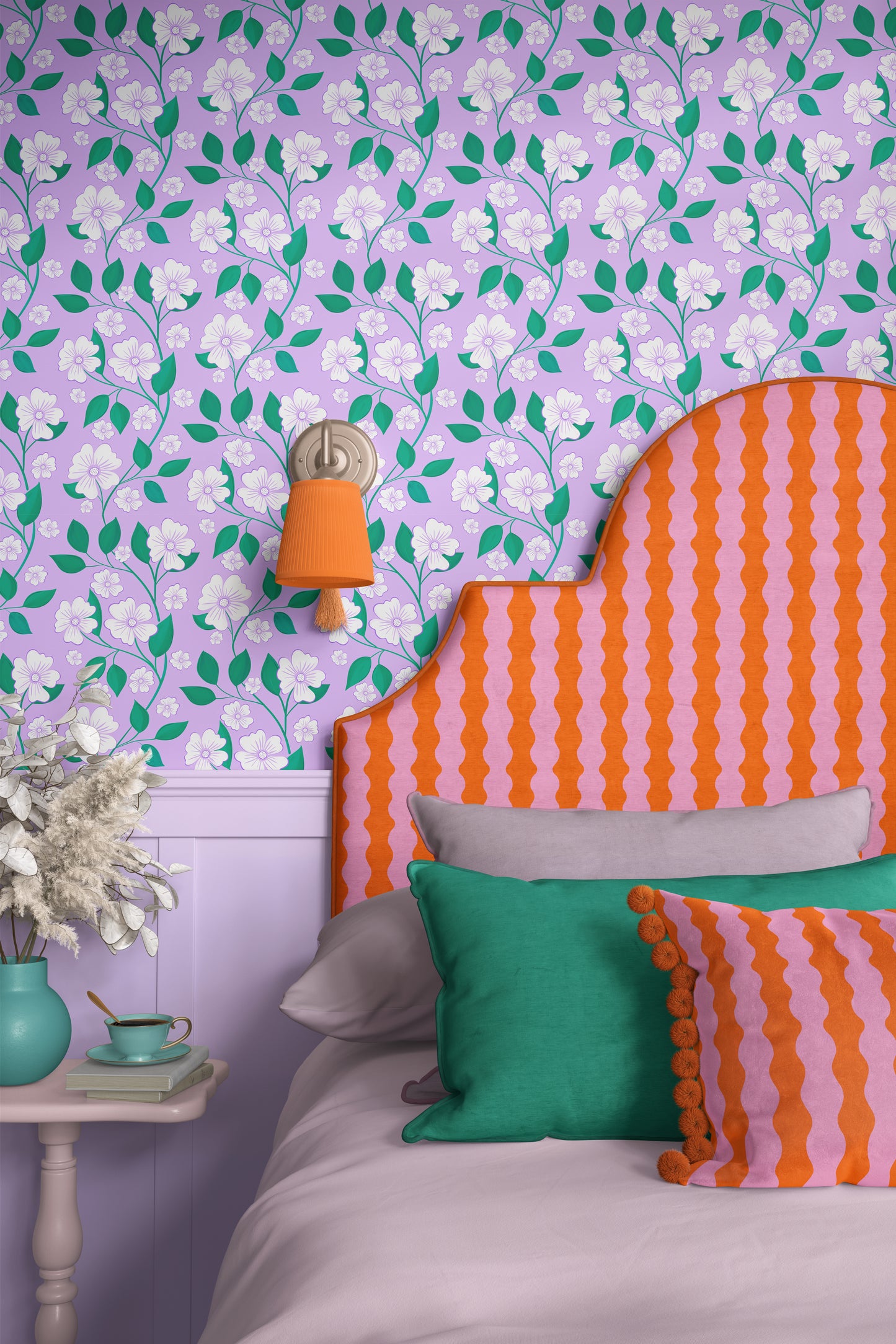 My ‘Blossom Trail’ wallpaper in lavender and mint green colours is a romantic, trailing floral design. Its delicate trailing blossoms will bring softness to your space. Perfect for creating a serene and charming environment, this wallpaper brings a subtle elegance that helps you celebrate the beauty in everyday life.