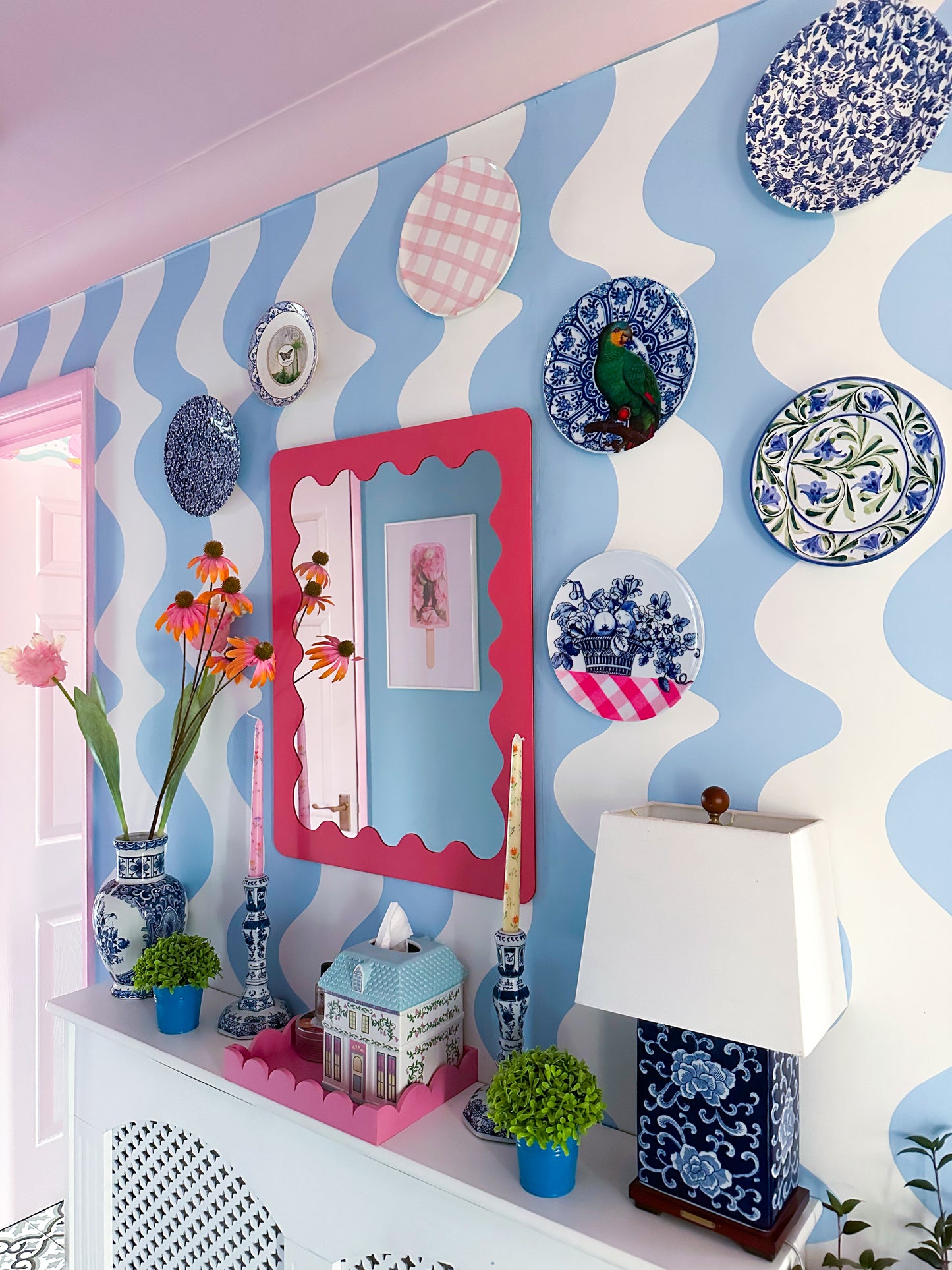 Blue and white reimagined in a modern way with my 'On The Same Wavelength' wallpaper. The pastel blue wavy stripes create a tranquil atmosphere and this wallpaper is sure to be a conversational piece in any room.