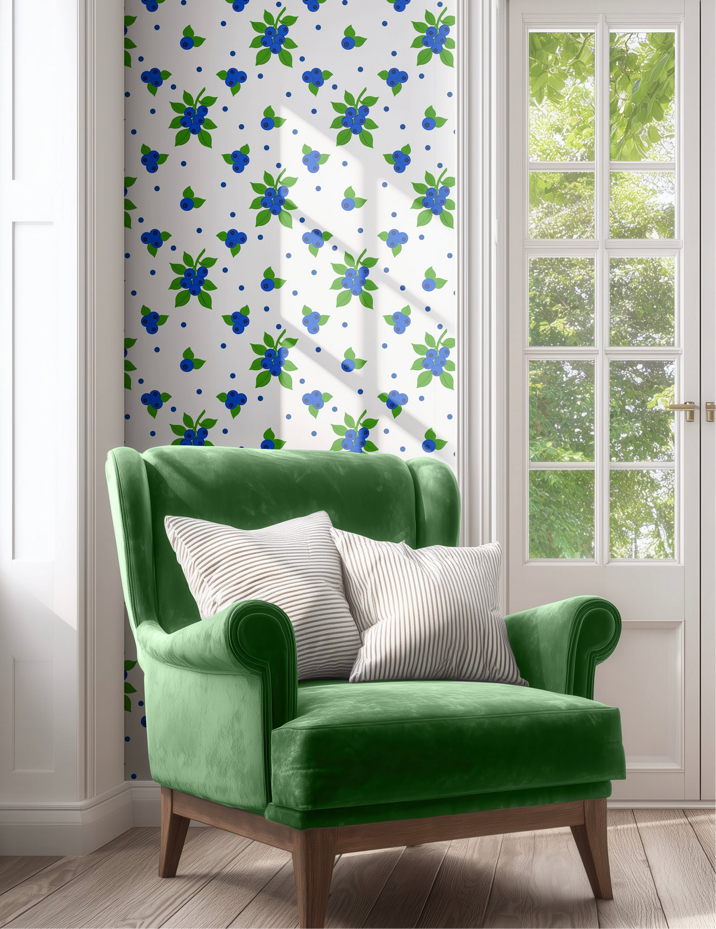 Bring a fresh, modern touch to your interiors with the 'Blueberry Romance' wallpaper. Featuring delicate blue berries and vibrant green leaves against a soft cream background, this stylish design adds an elegant, contemporary flair to any room. Perfect for creating a serene yet lively atmosphere, it elevates your space with natural charm and timeless sophistication.