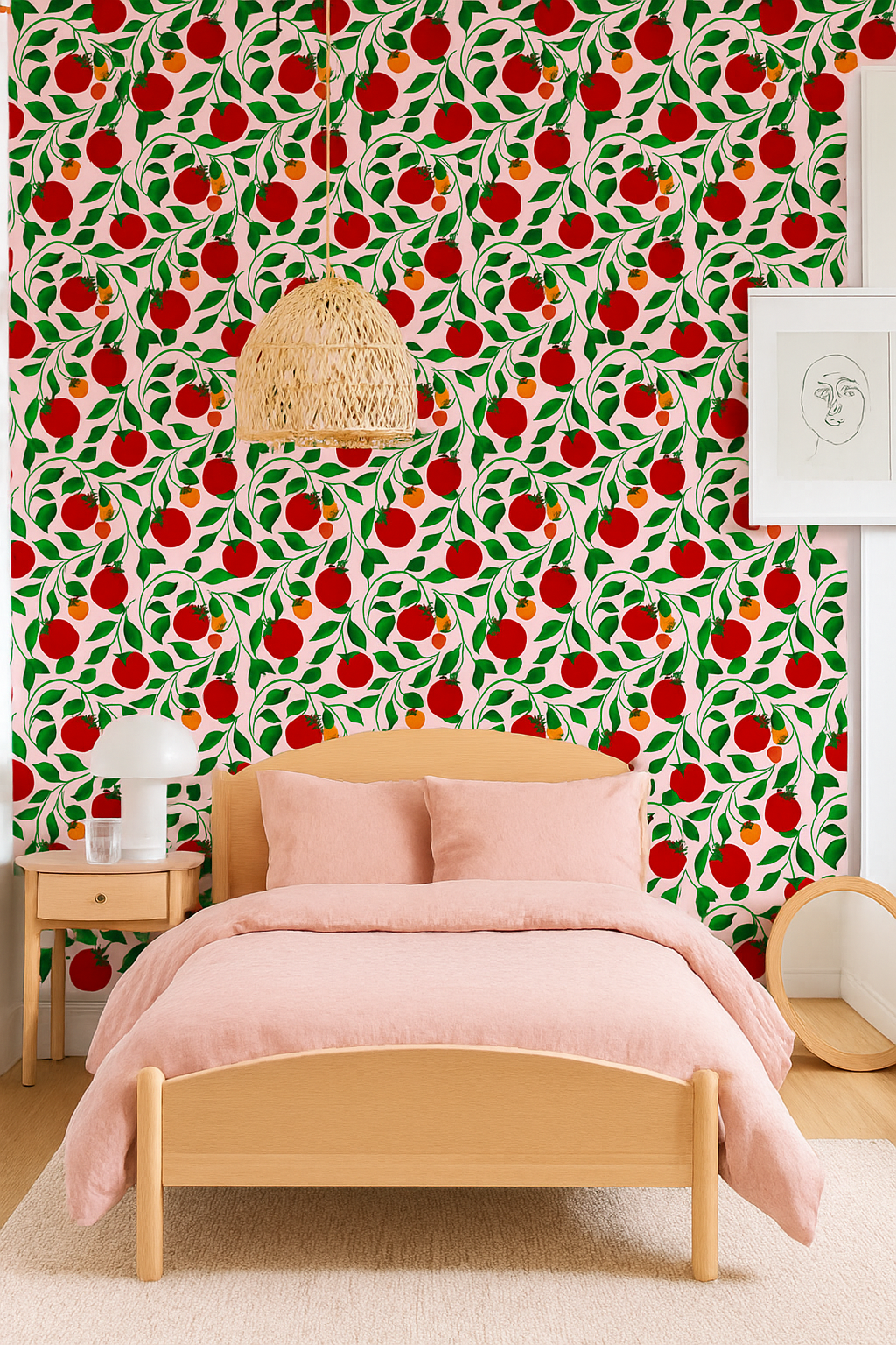 Add a vibrant touch to any room with the 'Tumbling Tomatoes' wallpaper. Featuring red and orange tomatoes cascading over lush vine leaves against a soft pink background, this design brings warmth and charm beyond the kitchen. Perfect for creating a lively, inviting atmosphere in living spaces, bedrooms, or dining areas, it transforms your walls into a fresh, artistic statement. Embrace a playful yet elegant look that brightens your home with natural beauty.