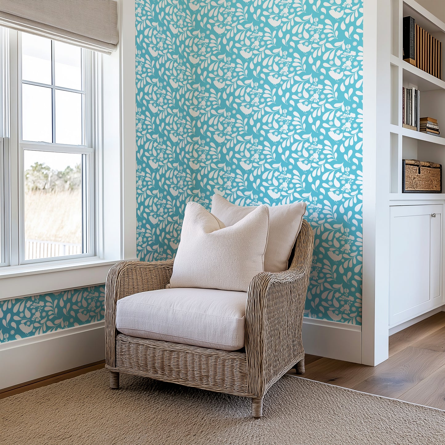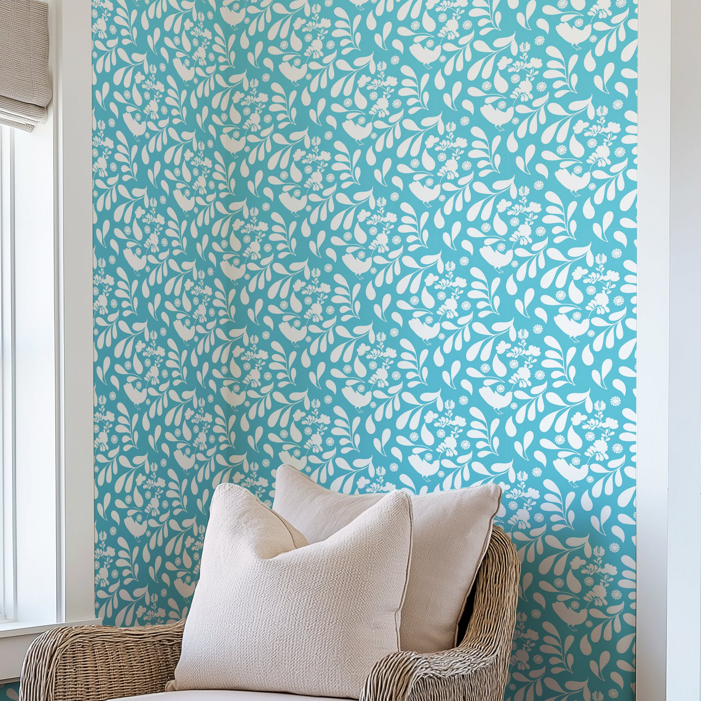 Transform your walls with this striking wallpaper featuring delicate singing birdie and botanical silhouettes in light lake blue and white colours. Inspired by traditional Hungarian motifs, the design brings timeless elegance to contemporary spaces.