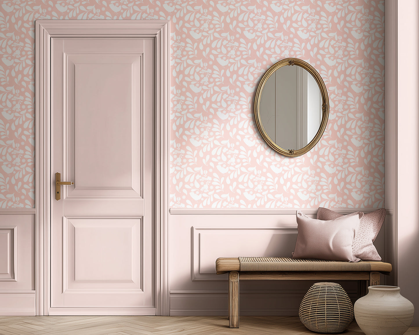 This beautiful, romantic wallpaper features traditional Hungarian folklore motifs. The white singing birdie is "hiding" among larger leaves, while its song delivers delicate flowers. The subtle soft pink background makes any room elegant and timeless.